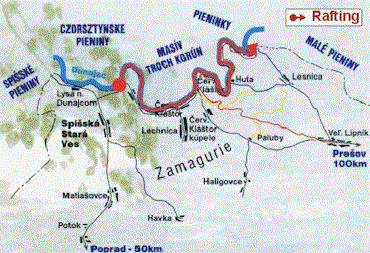 Rafting on the river of Dunajec in Pieniny We offer rafting in Pieniny, on the river of Dunajec on the Slovak-Polish border from 1st May to 30th October. The start of the sighseeing raft ride is in town of Spisska Stara Ves at Nokle and it finishes in Lesnica. The total length of the trip is 14.450 meter and it lasts 90-130 minutes depending on the hight of the river. During the ride tourists receive information about the flora and